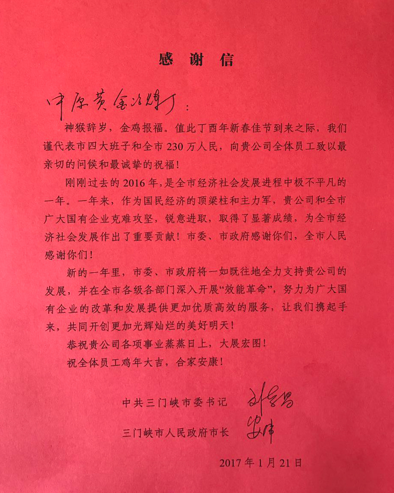 1月22日,三門峽市委、市政府給公司發(fā)來感謝信,市委書記劉南昌、市長安偉代表三門峽市四大班子和全市230萬人民,向公司全體員工致以最親切的問候和最誠摯的祝福,并對公司為三門峽市經(jīng)濟(jì)社會發(fā)展作出的貢獻(xiàn)表示感謝。