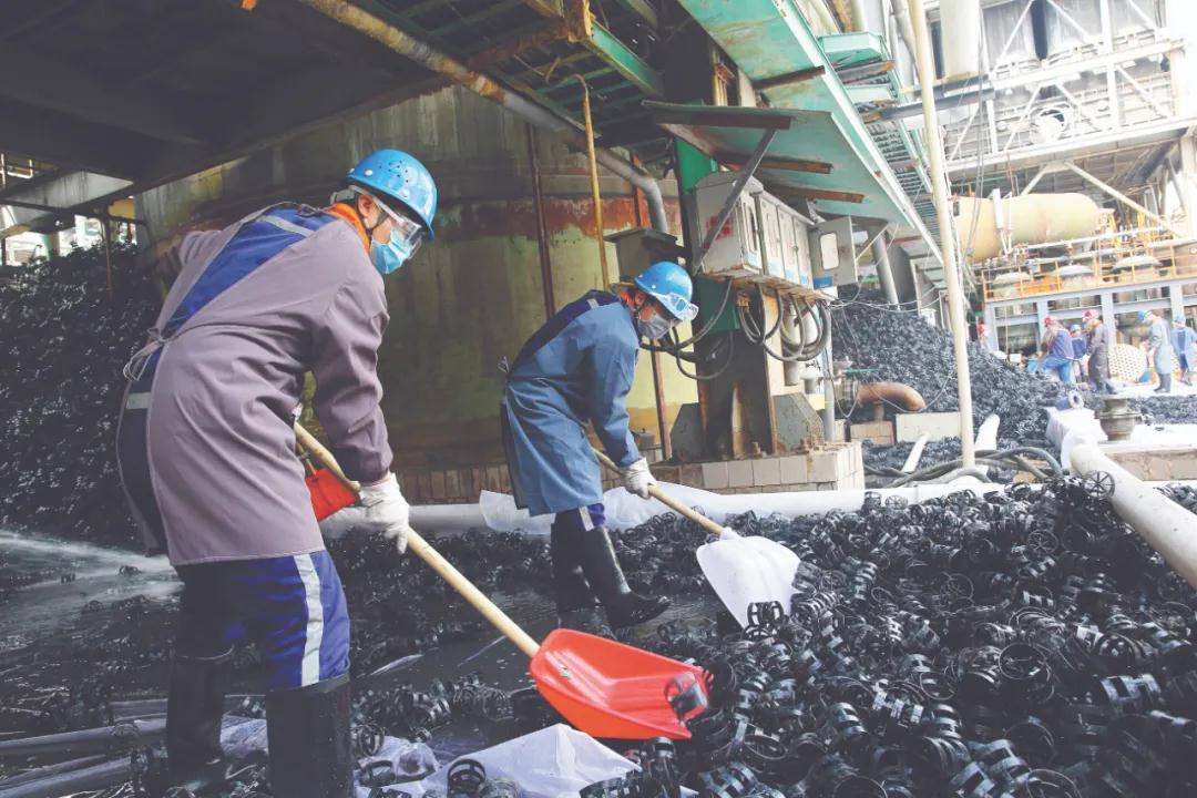 ▲中原冶煉廠制酸分廠檢修環(huán)集系統(tǒng),清理磁環(huán)再利用。